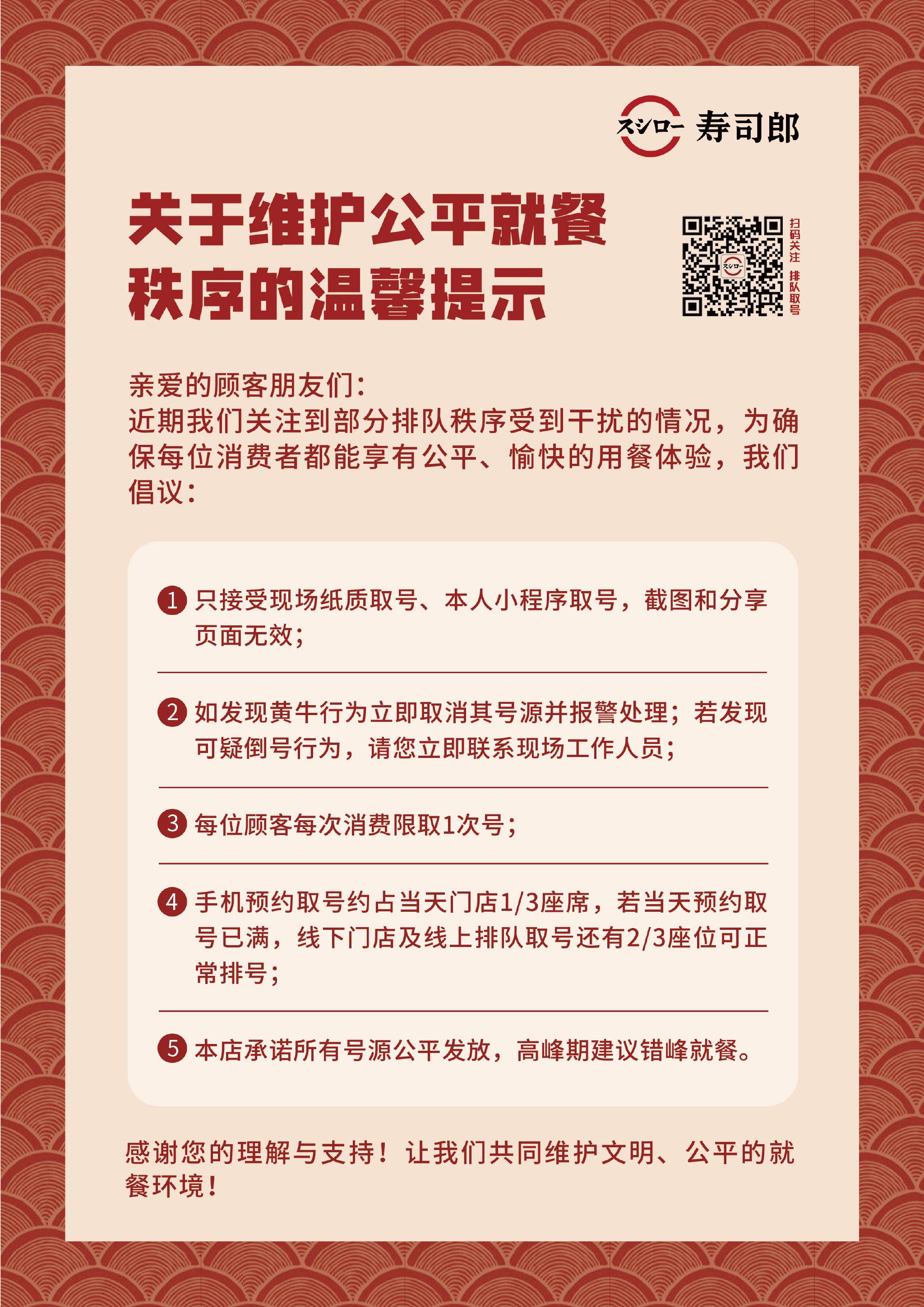 目前,寿司郎在其官方社交账号以及门店前都展示了一则维护就餐秩序的提示,包括只接受现场纸质取号、本人小程序取号,截图和分享页面无效;每位顾客每次消费限取一次号等。