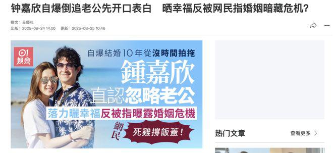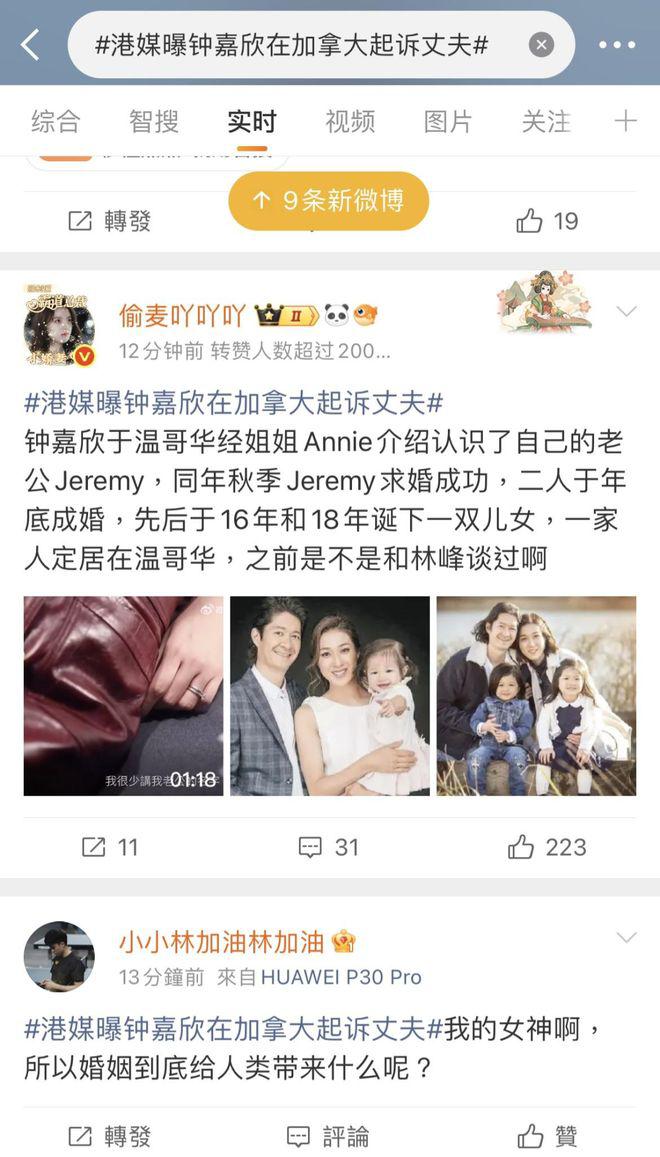 事情起源是上周微博热搜横空出世,说 TVB、大公报、明报等一众港媒爆出钟嘉欣在加拿大起诉丈夫。热搜写得有鼻子有眼:她今年 10 月 28 日直播时“晒出婚前协议副本”,直指脊医老公 Jeremy 限制她婚后收入支配权;又说她已向加拿大法院提出离婚诉讼,要求重新分配财产并争取子女抚养权。