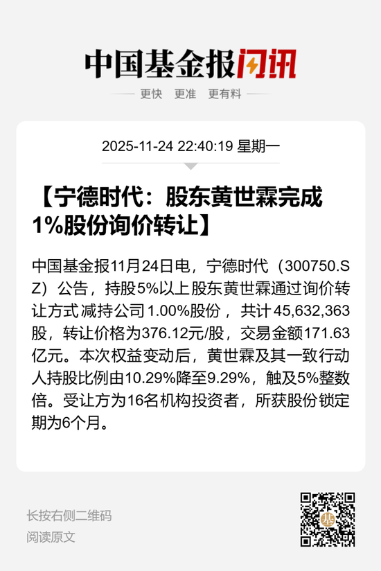 11月24日晚间,宁德时代发布公告称,公司持股5%以上股东黄世霖已完成询价转让1%股份的交易,询价转让价格为376.12元/股,交易金额为171.63亿元,受让方为16家机构投资者。