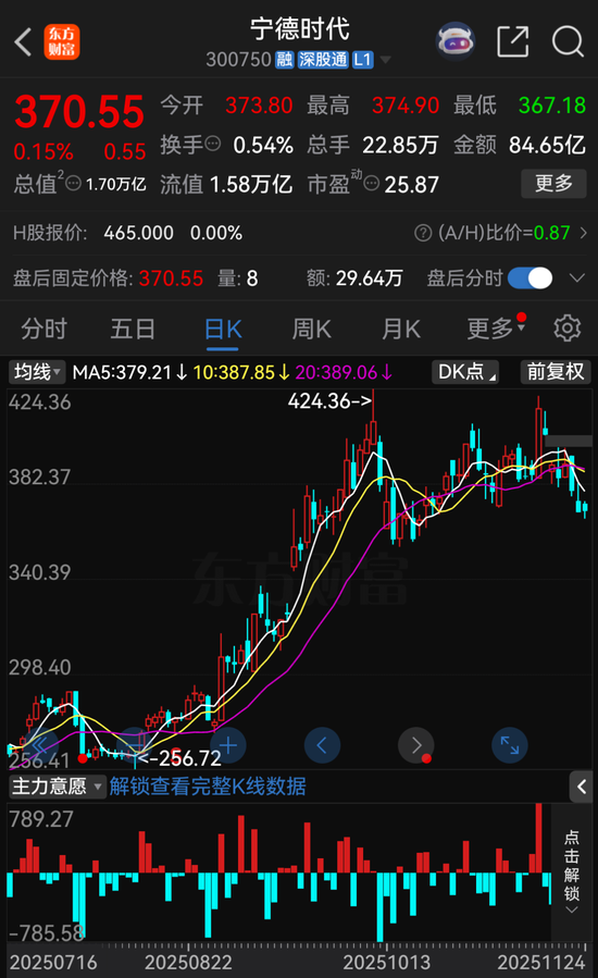 截至11月24日收盘,宁德时代A股股价报370.55元/股,涨幅达0.15%,总市值为1.70万亿元。