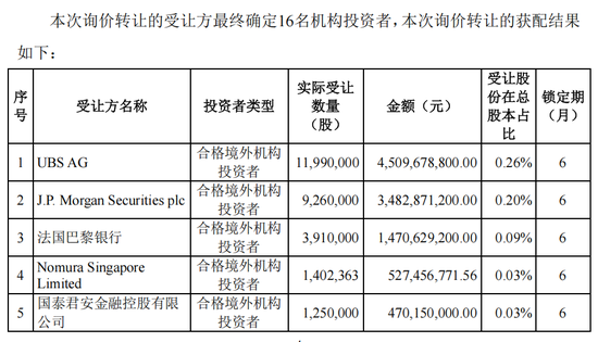 根据机构投资者申购报价情况,并严格按照《认购邀请书》中确定的询价转让价格、询价对象及获配股票的程序和规则,确定本次询价转让的价格为376.12元/股,转让股份数量为4563.24万股,交易金额达171.63亿元。
