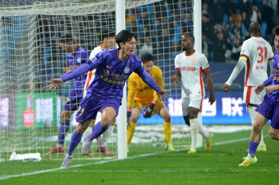 伤停补时第10分钟,谢维军(左)的进球帮助津门虎战平长春亚泰