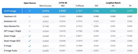 基于上述架构创新,GLM-Image在文字渲染的权威榜单中达到开源SOTA水平。