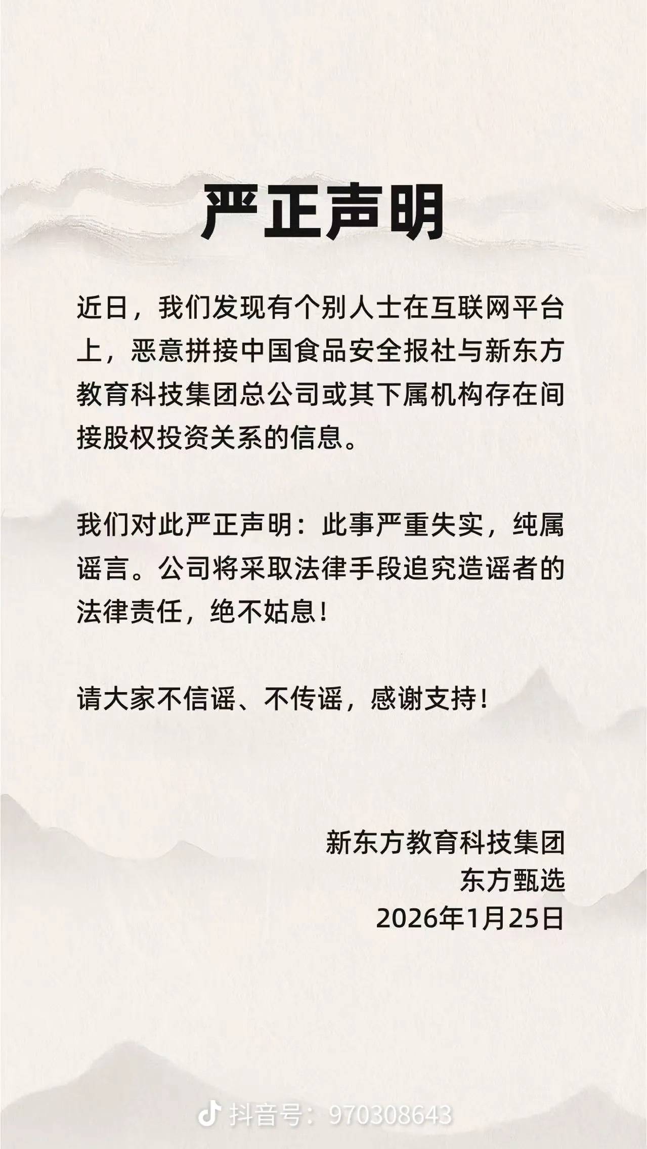 声明称,近日,我们发现有个别人士在互联网平台上,恶意拼接中国食品安全报社与新东方教育科技集团总公司或其下属机构存在间接股权投资关系的信息。此事严重失实,纯属谣言。公司将采取法律手段追究造谣者的法律责任。